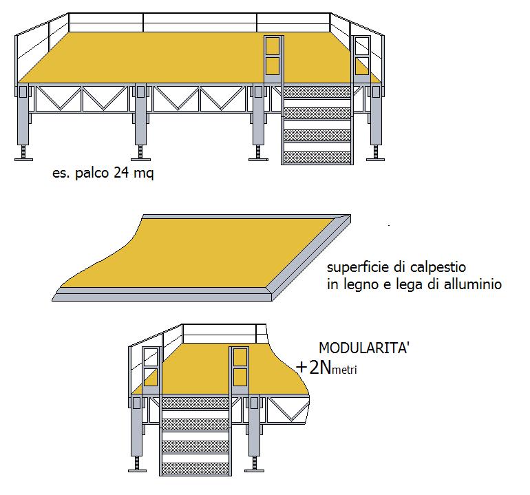 Palco modulare Selvoline tipo Deluxe, con superficie calpestabile fino a 200 mq, con struttura in ferro zincato e superficie di calpestio