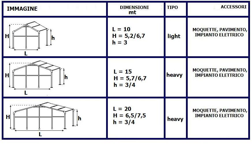 Le tensostrutture sono modulari, con tetto a due acque, di varie dimensioni, omologate, resistenza al vento zona 6, composti da strutture in alluminio con coperture e chiusure laterali scorrevoli in poliestere laccato in PVC, ignifughe, resistenti al fuoco classe “2” . Impianto elettrico. La struttura è conforme alle norme vigenti, viene rilasciato collaudo statico, certificato di corretto montaggio e certificato di conformità impianto elettrico CEI da tecnici abilitati. L'ancoraggio viene effettuato medianti tasseli, picchetti, ovvero plinti di portata adeguata, in funzione della superficie in cui installarla.